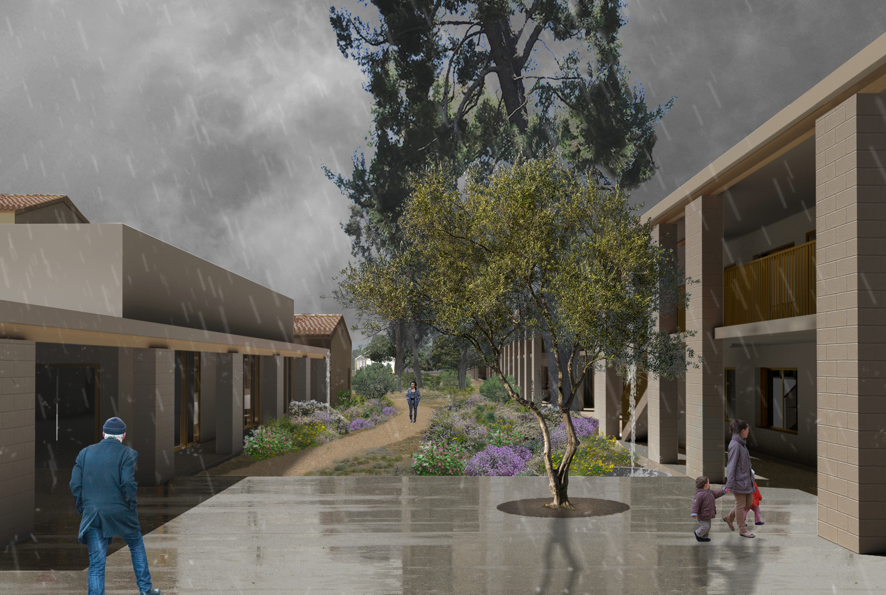 Within this community will be an urban farming program consisting of aquaponics in the greenhouse, a citrus garden, a “food forest” (an ecosystem of compatible fruit and vegetable bearing planting groups), Native American traditional plants and a bio-swale, marking the changing of seasons. The large yard between the housing and the parish hall (the Meadow) will be the main agricultural area, with raised vegetable beds, Native American “Three Sisters” planting (corn, beans, and squash), and a field for seasonal rotational planting of seasonal crops. A children’s play area, with its own seasonal planting bed (sunflowers, sweet peas, etc.) is placed in its midst. Biblical plants symbolic of Christian sacraments (wheat, grapes and olives) will be included. Seeds of Hope, a food justice ministry of the Episcopal Diocese of Los Angeles, will supervise the urban farming program on the campus. The large garden will be a tapestry, weaving together the various users of the campus around a central gathering circle. A bio-swale running along the dwelling units will mark the changing of the seasons with fresh green leaves and flowering plants in Spring giving way to drought-tolerant plants (sage, buckwheat, flannel bush and grasses) surviving the warm weather months. While the cultivated portions of monastic gardens always included useful plants.